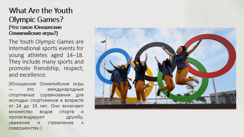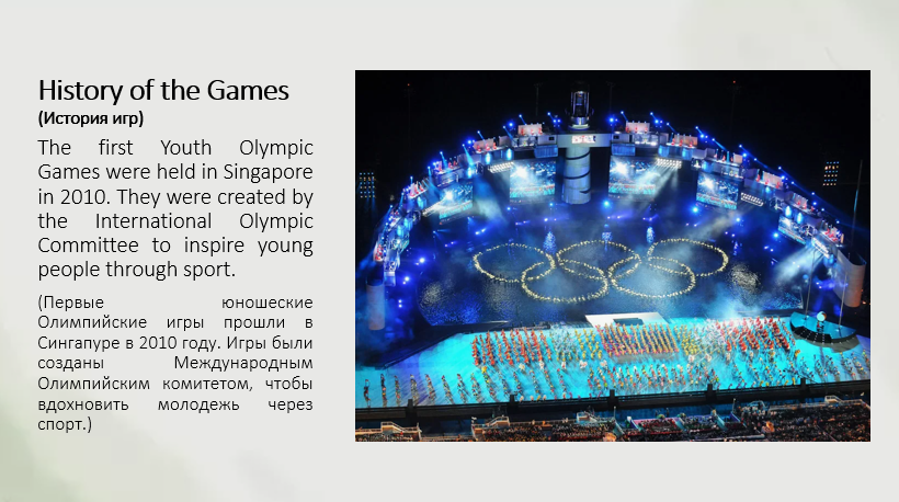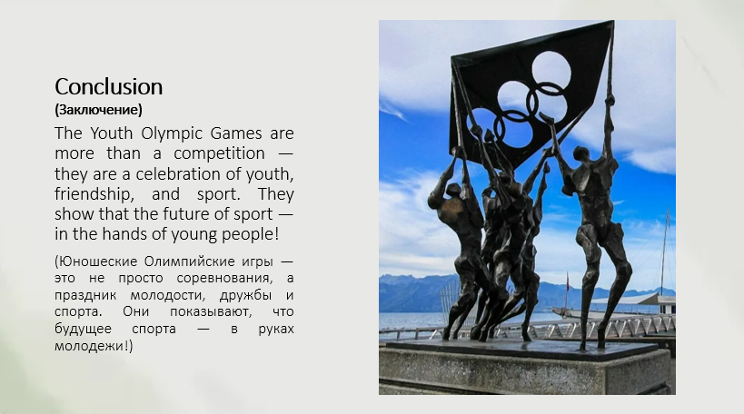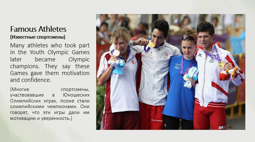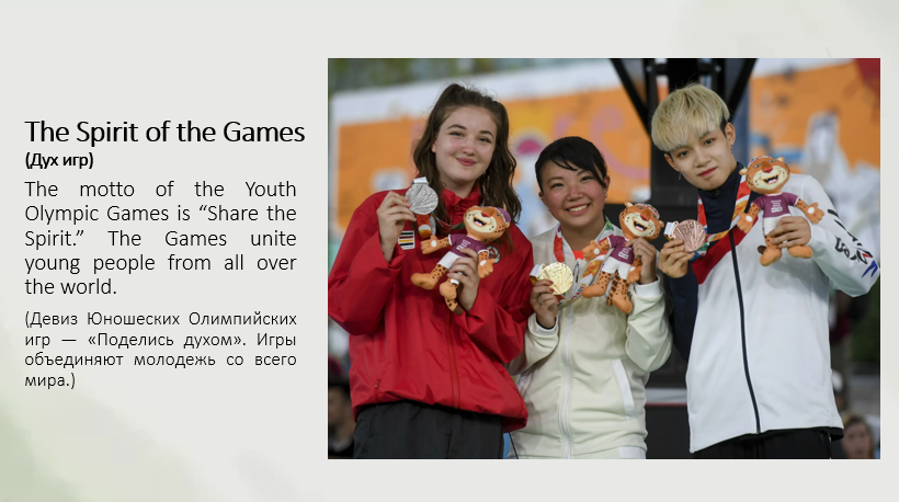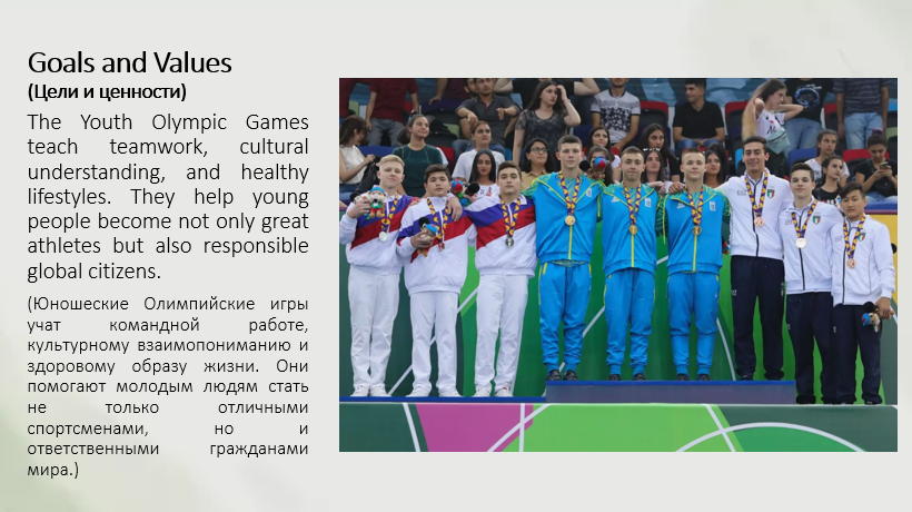• The cultural programme: → Showed the national culture and traditions of Russia; included meetings with Olympians and trips to the best historic and cultural centres. (Показывала национальную культуру и традиции России; включала встречи с олимпийцами и поездки в лучшие исторические и культурные центры.)