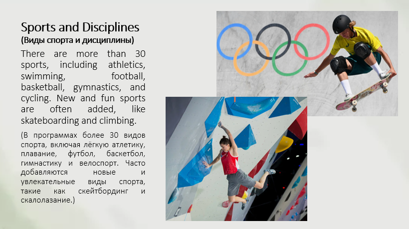 • The sports programme: → Included fifteen most popular sports: soccer, volleyball, basketball, swimming, tennis, light athletics and others. (Включала пятнадцать самых популярных видов спорта: футбол, волейбол, баскетбол, плавание, теннис, легкая атлетика и другие.)