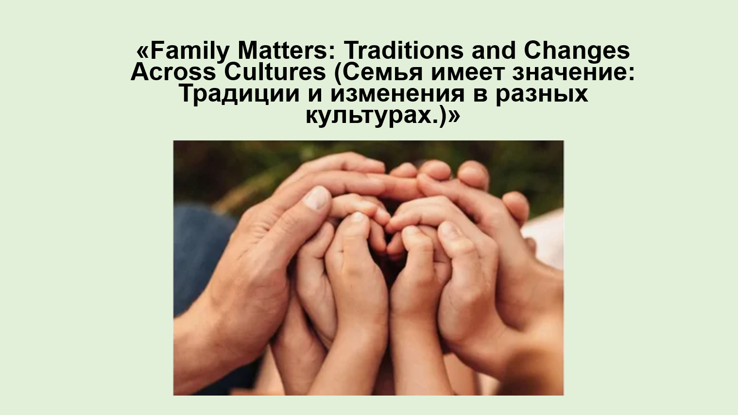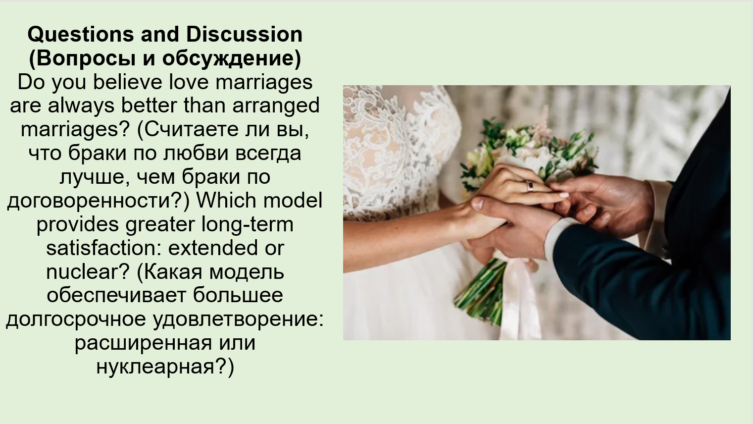Find some information about what families were like in different periods in history or about the specific features of family and marriage in different cultures. Think of how to present it in the class in the most interesting way. Give your presentation. Remember that it shouldn't exceed 5–7 minutes. Decide whose presentation is the best and why. (Найдите информацию о том, какими были семьи в разные периоды истории или об особенностях семьи и брака в разных культурах. Подумайте, как представить ее в классе наиболее интересным способом. Сделайте свою презентацию. Помните, что она не должна превышать 5–7 минут. Решите, чья презентация лучшая и почему.)
