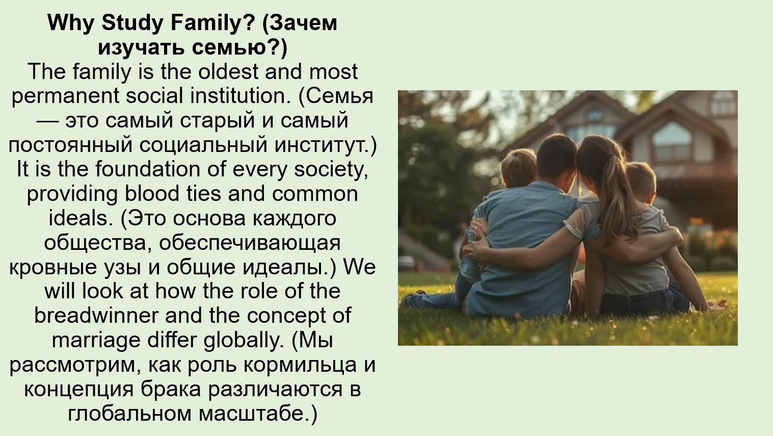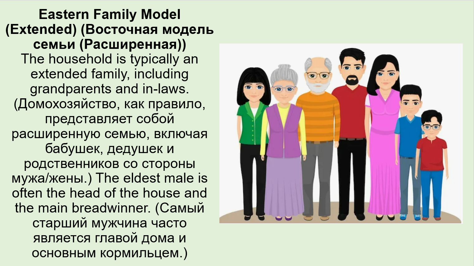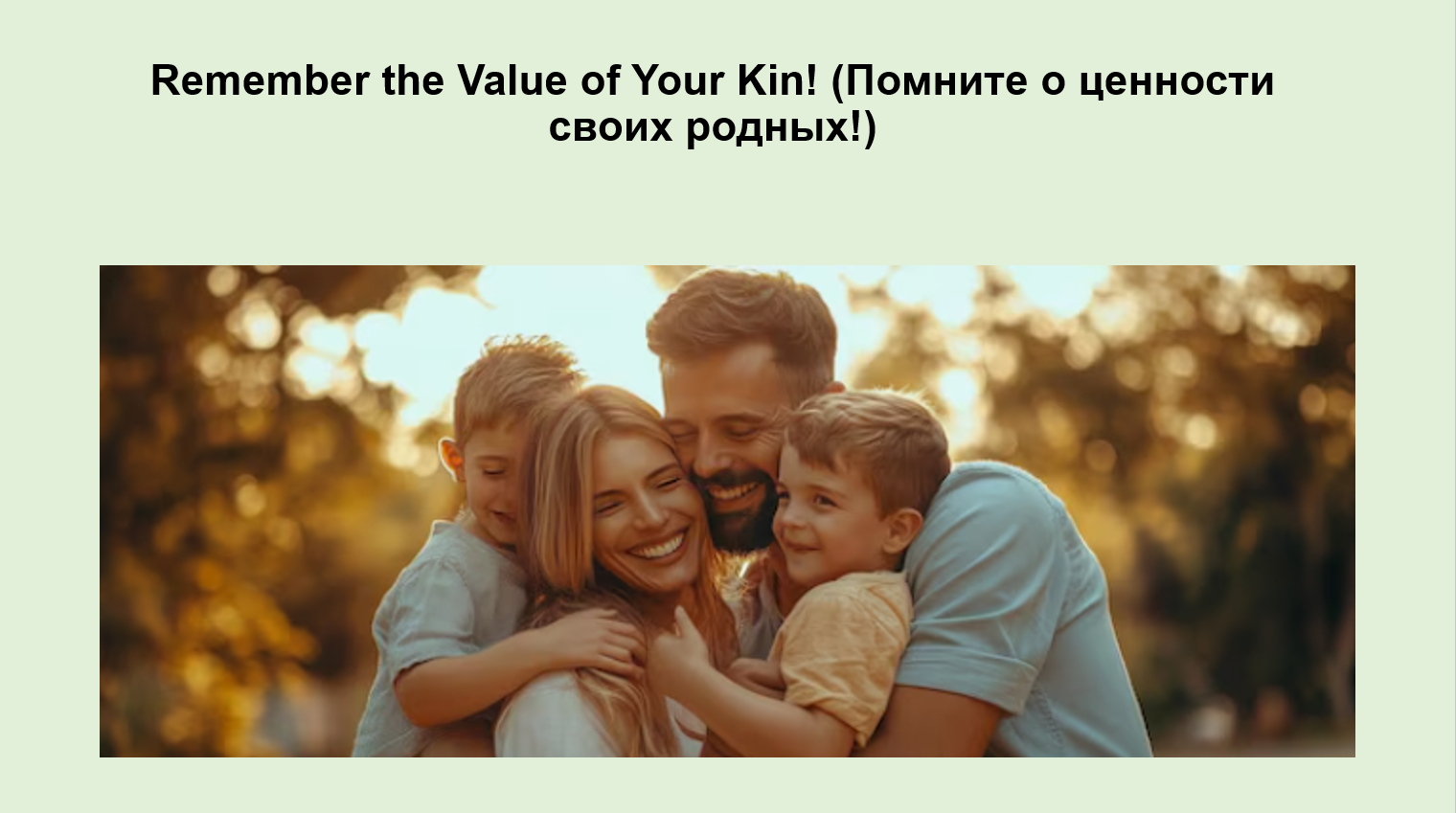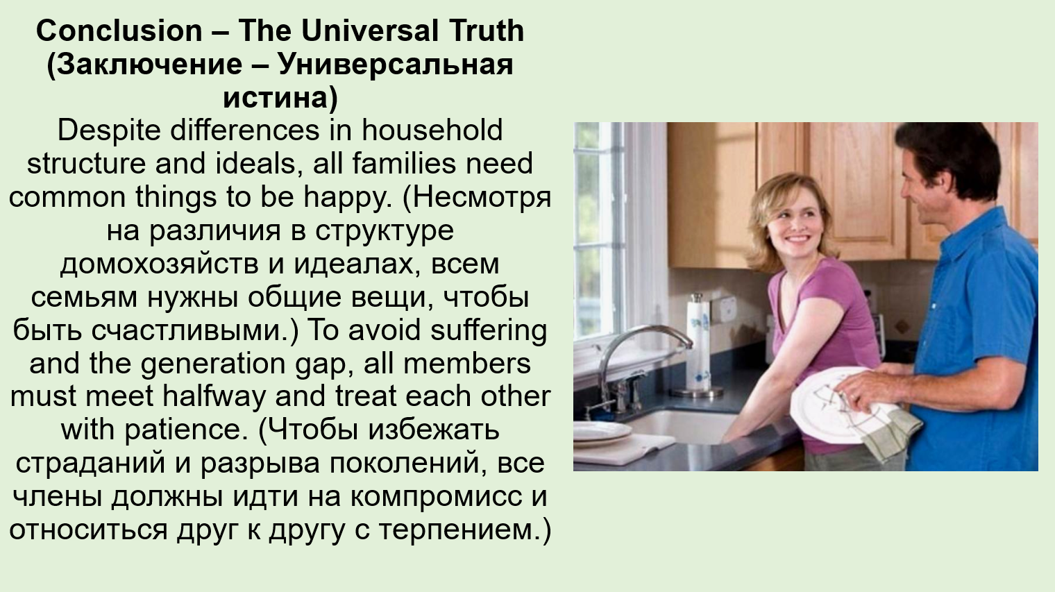 Добавить текст Вернуть оригиналCommunication (Общение) and respect (уважение) are the most important factors that prevent a generation gap (разрыв поколений) and ensure a happy household (счастливое домохозяйство).