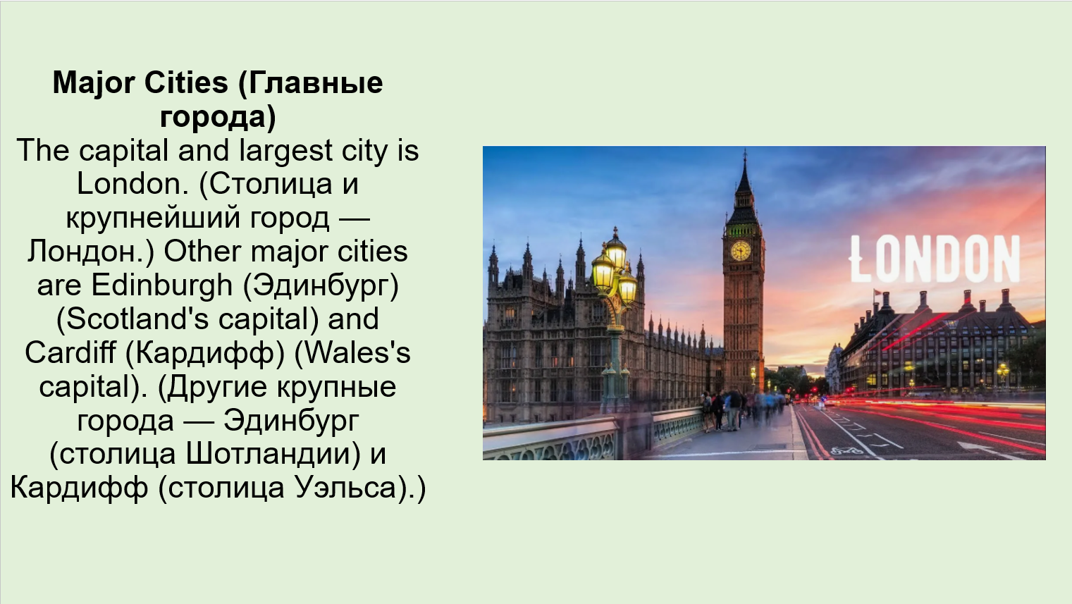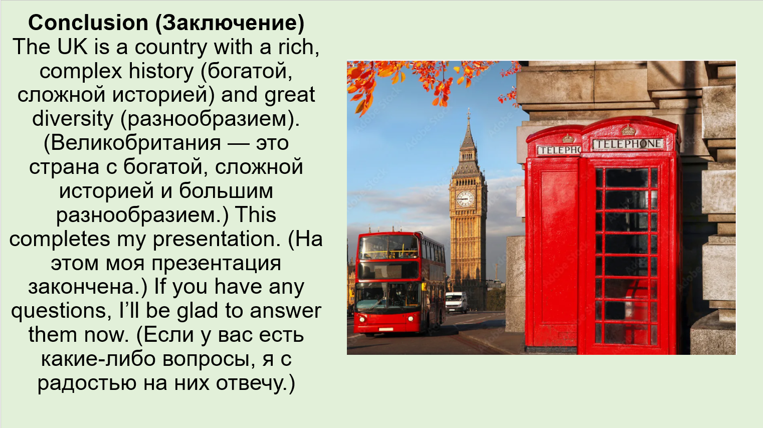 5. Choose one of the countries: Russia, Great Britain, or the United States of America. Arrange the presentation of the country following the guidelines. Be ready to answer your classmates’ questions. The beginning and the ending of the presentation are done for you. (Выберите одну из стран: Россию, Великобританию или Соединенные Штаты Америки. Подготовьте презентацию страны, следуя инструкциям. Будьте готовы ответить на вопросы одноклассников. Начало и конец презентации уже сделаны для вас.)