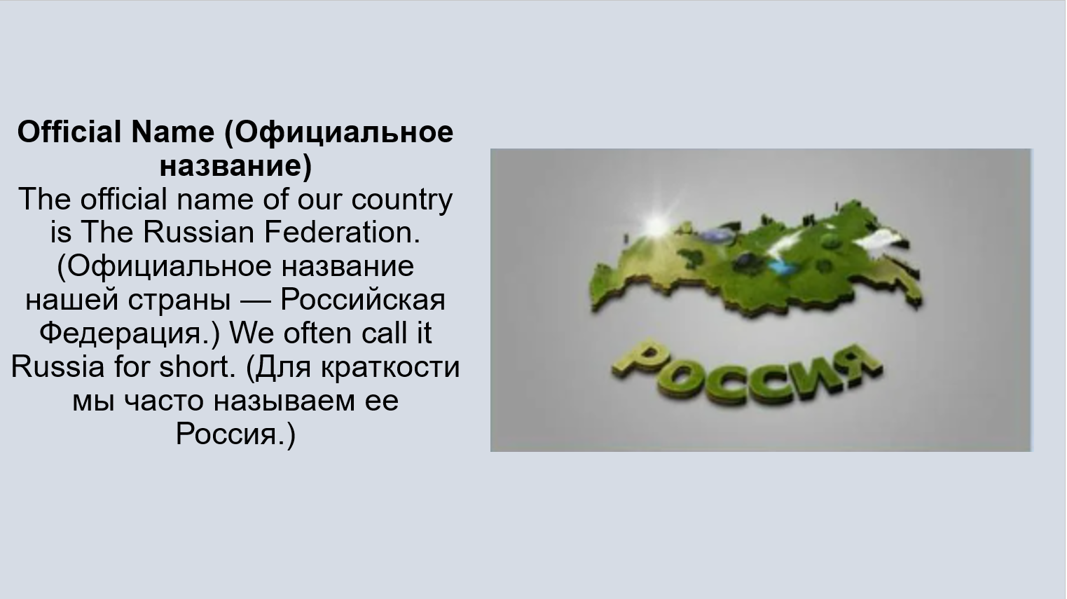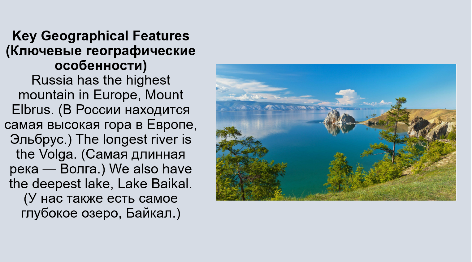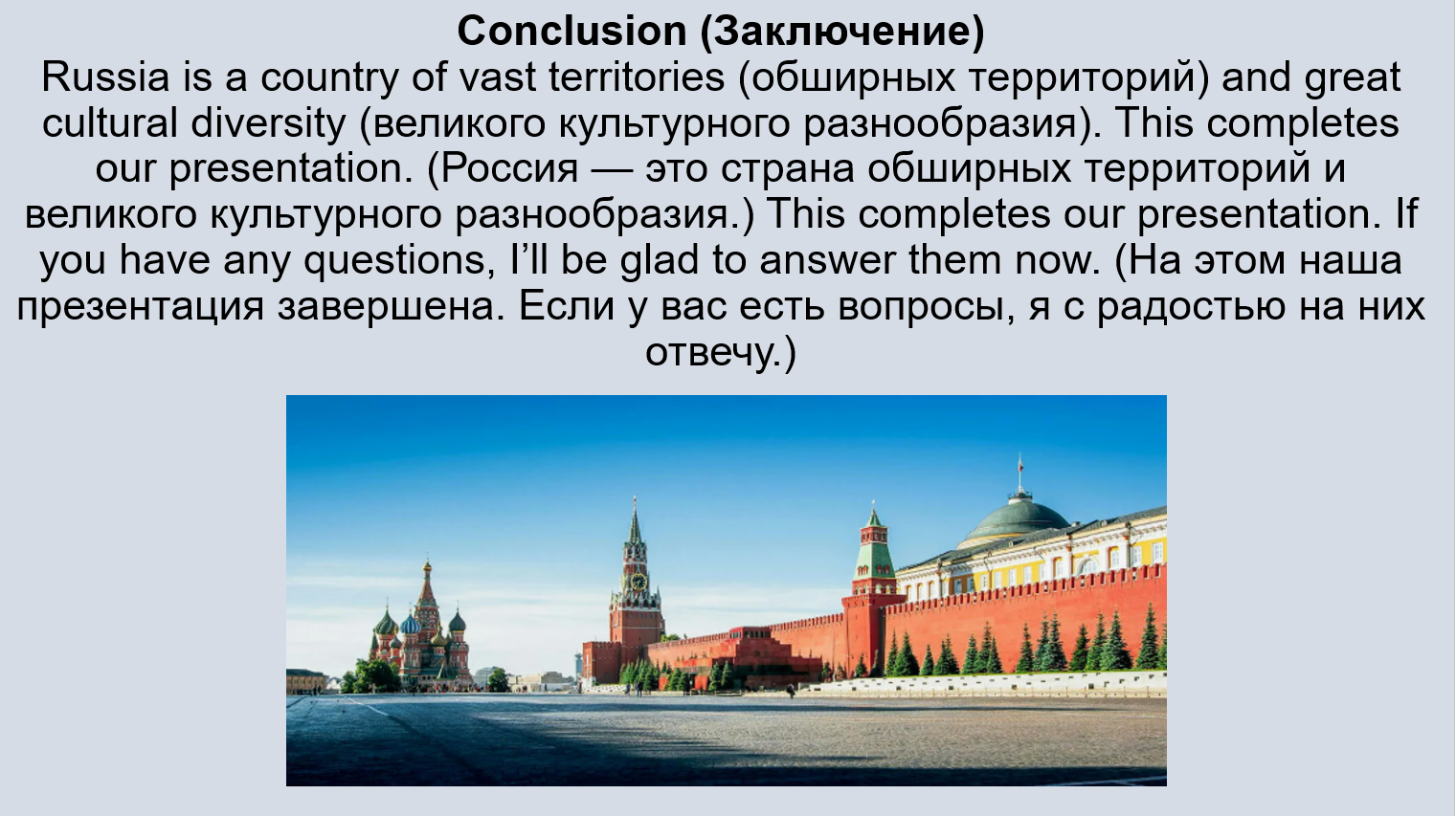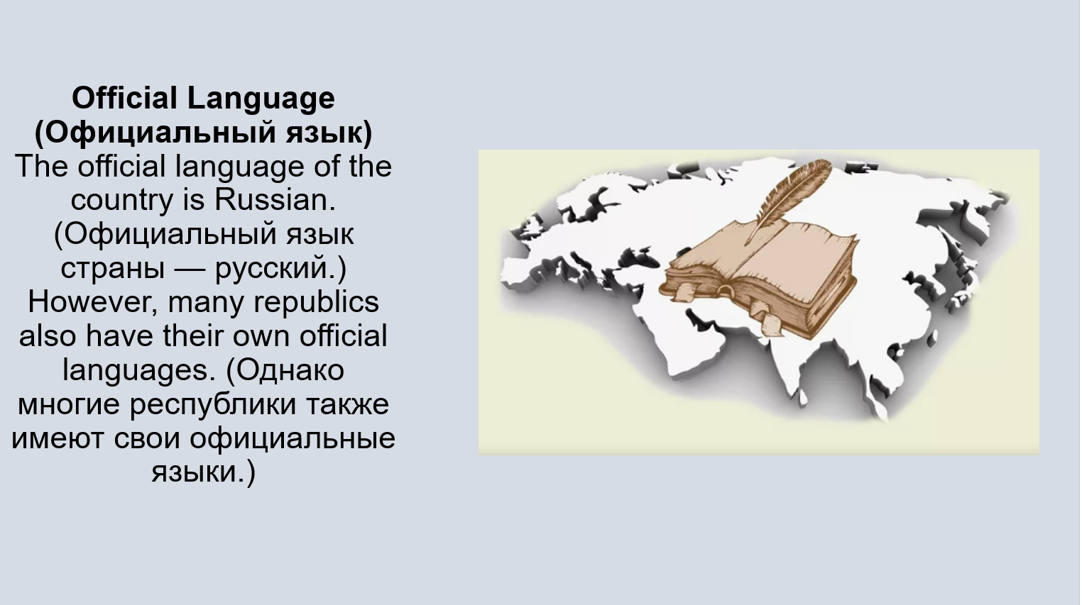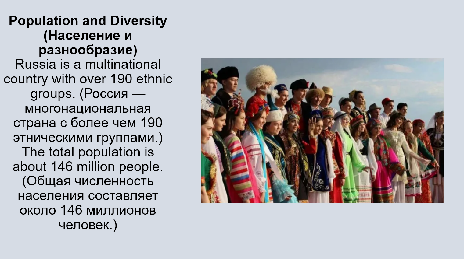 3. Cultural Diversity: The statistics on population (население) and ethnic groups (этнические группы) (over 190 nationalities) define Russia as a multinational country (многонациональная страна), which impacts the need for unity and respect for different local symbols and languages. (Статистика по населению и этническим группам (более 190 национальностей) определяет Россию как многонациональную страну, что влияет на необходимость единства и уважения к различным местным символам и языкам.)