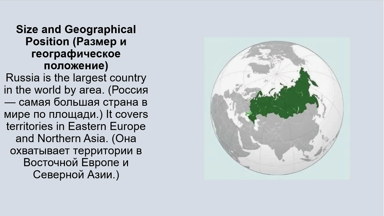 1. Geography and Area: The figures show Russia is the largest country in the world by area (самая большая страна в мире по площади), which is reflected in the Double-Headed Eagle (Двуглавый орел) emblem looking both East and West, across its massive Eurasian territory. (Цифры показывают, что Россия — самая большая страна в мире по площади, что отражено в эмблеме Двуглавого орла, смотрящего и на Восток, и на Запад, через ее обширную евразийскую территорию.)
