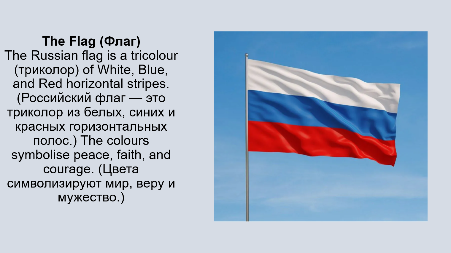 The colours of the flag are White, Blue, and Red (Белый, Синий и Красный). (Цвета флага — Белый, Синий и Красный.)