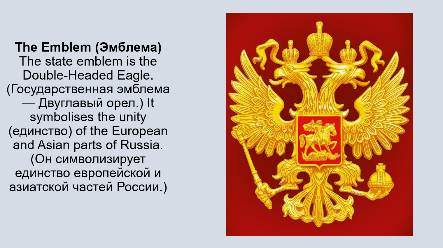 2. History and Symbols: The restoration of the White-Blue-Red Tricolour (бело-сине-красного Триколора) and the Double-Headed Eagle (Двуглавого орла) in the 1990s reflects a return to historic statehood (исторической государственности) and pre-Soviet traditions. (Восстановление бело-сине-красного Триколора и Двуглавого орла в 1990-х годах отражает возвращение к исторической государственности и досоветским традициям.)