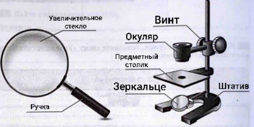 1. Используя текст параграфа и рисунок 43, изучите устройство ручной и штативной луп. Подпишите на рисунках их основные части.