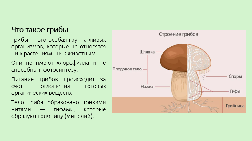 Добавить текст Озвучить Вернуть оригиналГрибы — это особая группа живых организмов, которые не относятся ни к растениям, ни к животным. Они не имеют хлорофилла и питаются готовыми органическими веществами. Тело гриба образовано нитями — гифами, из которых состоит грибница.