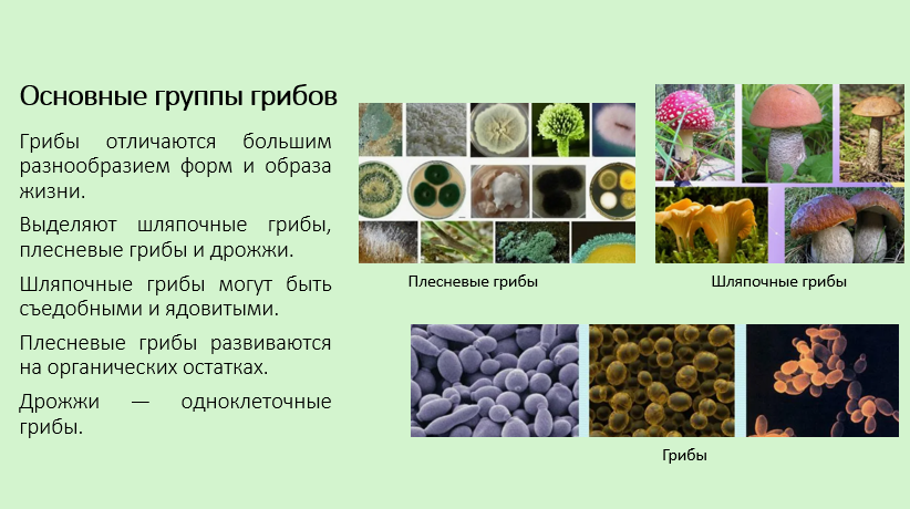 Добавить текст Озвучить Вернуть оригиналГрибы отличаются большим разнообразием. Выделяют шляпочные грибы, плесневые грибы и дрожжи. Шляпочные грибы бывают съедобными и ядовитыми. Плесневые грибы развиваются на продуктах и органических остатках, а дрожжи используются человеком в хозяйстве.