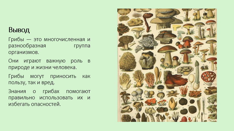 Добавить текст Озвучить Вернуть оригиналГрибы имеют большое значение в жизни человека. Их используют в пищу, в хлебопечении, медицине и производстве продуктов. Однако некоторые грибы опасны, так как являются ядовитыми или вызывают заболевания.