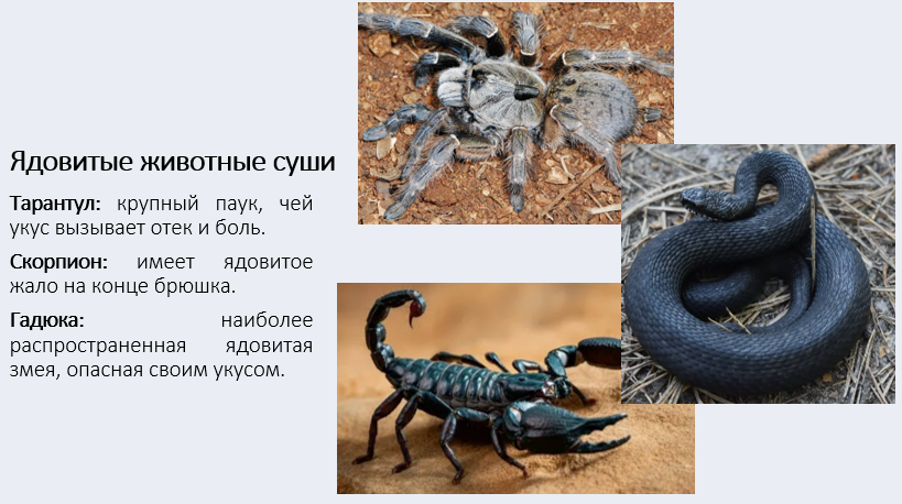 Добавить текст Озвучить Вернуть оригинал2. Ядовитые животные суши. Характеристика опасных паукообразных (тарантул, скорпион) и пресмыкающихся (гадюка).