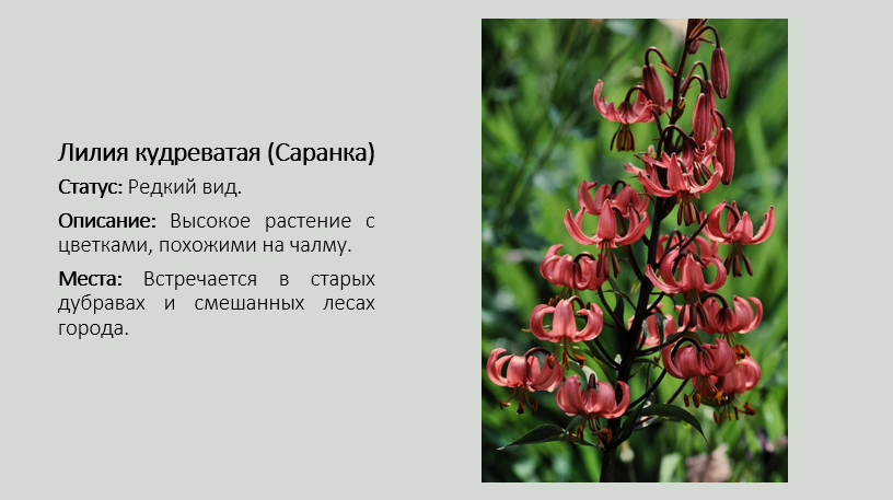 Добавить текст Озвучить Вернуть оригиналОдним из самых красивых и редких растений Москвы является лилия кудреватая, или саранка. Это многолетнее растение с крупными розово-пурпурными цветками, лепестки которых закручены назад. Она встречается в старых лесопарках, например, в Битцевском лесу. Другое редкое растение — печёночница благородная. Это первоцвет, который зацветает сразу после схода снега. Из-за своей красоты она часто становится жертвой любителей весенних букетов, что приводит к её исчезновению в черте города.