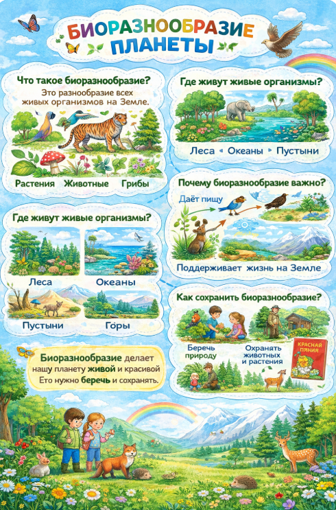 Добавить текст Озвучить Вернуть оригинал5. Оформите плакат «Биоразнообразие планеты». Устройте выставку работ.