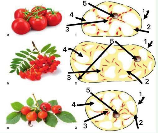 4. Сравните форму и особенности пластид изученных клеток с изображёнными на рисунке 12 учебника. Определите, под каким номером изображены клетки плодов рябины, томата, шиповника, соотнесите их с рисунками плодов.
