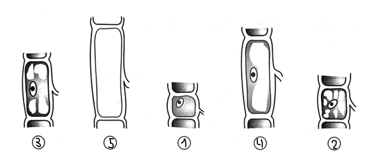 1. В самой молодой клетке содержится много мелких вакуолей, а ядро располагается в центре.