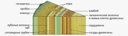 2. Приготовьте поперечный и продольный срезы ветки. С помощью лупы рассмотрите слои стебля на срезах. Используя текст параграфа 10 и рисунок 38, определите название каждого слоя.