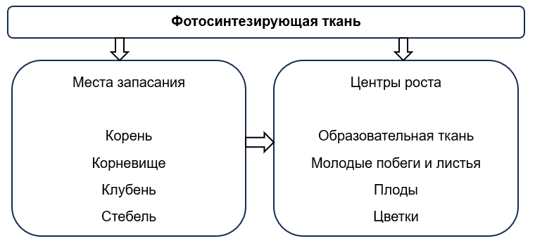2. Заполните схему «Передвижение органических веществ в растении», записав в неё следующие понятия: молодые побеги и листья, стебель, корень, клубень, корневище, образовательная ткань, цветки, плоды.