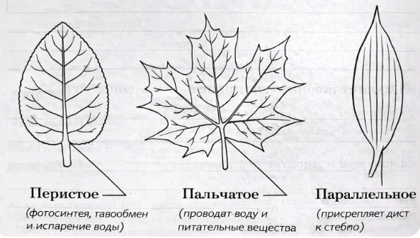 4. Дорисуйте жилкование листа на предложенных листовых пластинках и подпишите типы жилкования.
