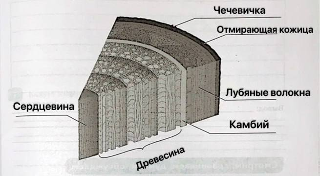 Древесина проводит воду и минеральные вещества и придаёт прочность.