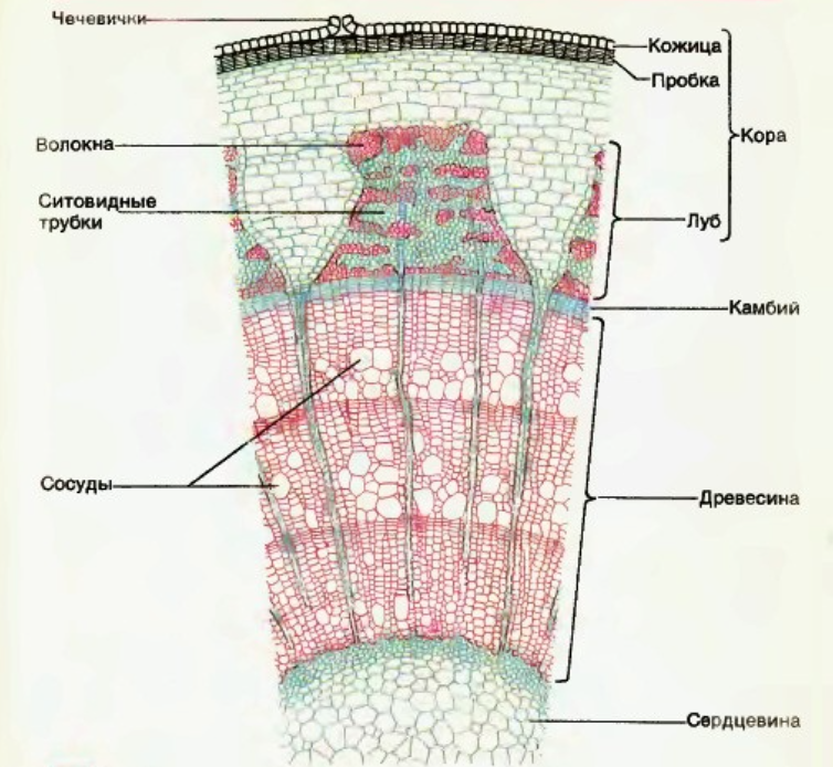 2. Найдите основные слои стебля, рассмотрите особенности их строения, вспомните, какие функции они выполняют.