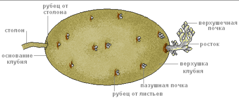 1. Рассмотрите внешний вид клубня картофеля. Найдите на нём верхушку, основание, глазки-почки.