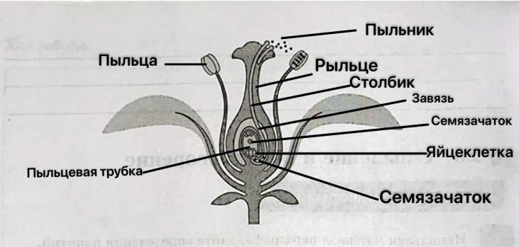 3. Рассмотрите рисунок «Оплодотворение у цветковых растений». Укажите и подпишите на нём части цветка, участвующие в процессе оплодотворения.
