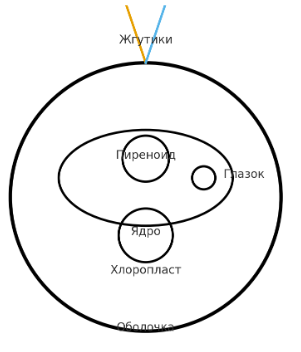 Особенность строения хламидомонады: два жгутика, светочувствительный глазок (стигма), две сократительные вакуоли и крупный чашевидный хлоропласт.