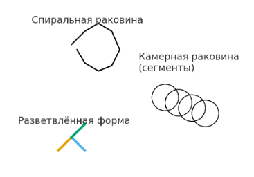 3. Зарисуйте в рабочей тетради раковинки, имеющие различное строение (спиральную, прямую, двурядную).