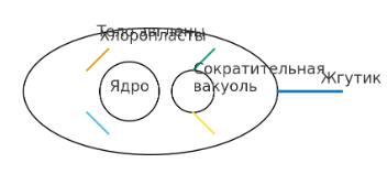 Структуры клетки эвглены: Ядро с ядрышком, хлоропласты (обеспечивают зелёный цвет), сократительная вакуоль, светочувствительный глазок (стигма), жгутик и пелликула.