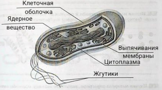 1. Изучив материал параграфа, подпишите части бактериальной клетки. Укажите: наследственное (ядерное) вещество, клеточную оболочку, мембрану, цитоплазму, жгутики.