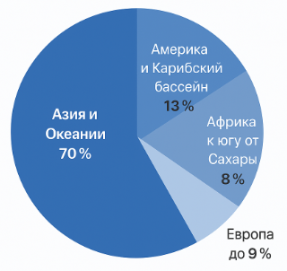 Добавить текст Вернуть оригинал9. Одним из самых распространённых геогельминтозов является аскаридоз. Это заболевание встречается у 70% жителей Азии и Океании, 13% — Америки и Карибского бассейна, 8% — Африки к югу от Сахары и до 9% — Европы. Представьте данные по распространению аскаридоза в мире в виде круговой диаграммы, позволяющей оценить соотношение величин.