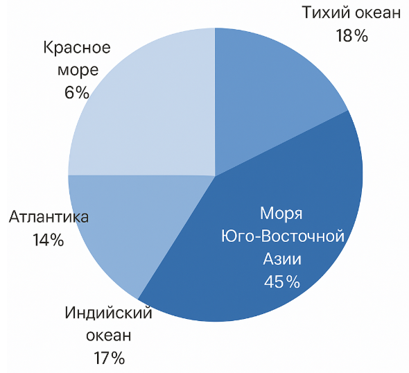 Добавить текст Вернуть оригиналСледовательно, регионы, такие как Моря Юго-Восточной Азии, имеют наиболее благоприятные условия (тёплые мелководья, богатые солнечным светом), что объясняет их долю в 45%.