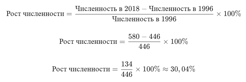 Добавить текст Вернуть оригиналДля расчёта берём данные за 1996 год (446 особей) и 2018 год (580 особей).
