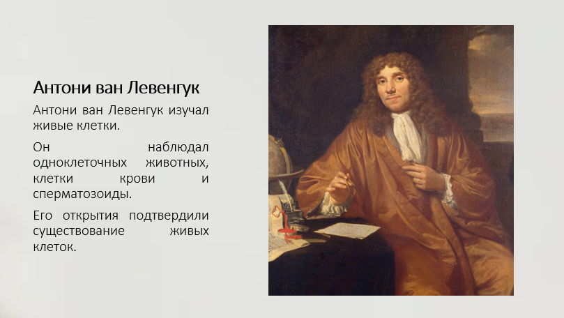 Добавить текст Озвучить Вернуть оригиналБольшой вклад в изучение живых клеток внёс Антони ван Левенгук. Он усовершенствовал микроскоп и впервые описал живые одноклеточные организмы, клетки крови и сперматозоиды. Его наблюдения доказали, что живые организмы состоят из мельчайших структур.