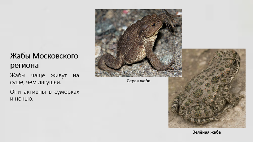 Добавить текст Озвучить Вернуть оригиналВ Московском регионе встречаются различные виды лягушек, жаб и тритонов. Наиболее распространены травяная лягушка, прудовая лягушка, остромордая лягушка, серая жаба, зелёная жаба, обыкновенный тритон и гребенчатый тритон.