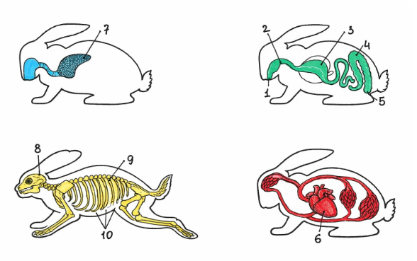 2. Изучив материал параграфа, раскрасьте внутренние органы млекопитающего (зелёным цветом — органы пищеварительной системы, красным — органы кровеносной системы, голубым — органы дыхания, жёлтым — органы нервной системы) и подпишите их названия.
