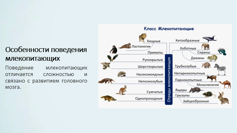 Добавить текст Озвучить Вернуть оригиналМлекопитающие отличаются сложным поведением, которое связано с высоким уровнем развития их нервной системы и головного мозга. Поведение млекопитающих включает как врождённые, так и приобретённые формы и помогает животным приспосабливаться к условиям окружающей среды.