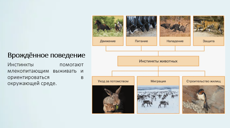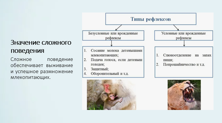 Добавить текст Озвучить Вернуть оригиналСложное поведение млекопитающих повышает их шансы на выживание и успешное размножение.