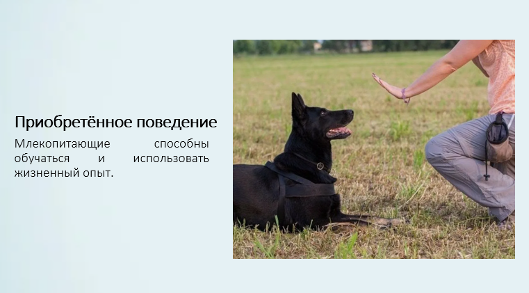 Добавить текст Озвучить Вернуть оригиналПриобретённое поведение формируется в процессе жизни и основано на обучении и накоплении опыта. Многие млекопитающие способны запоминать, обучаться новым действиям и использовать прошлый опыт в новых ситуациях.