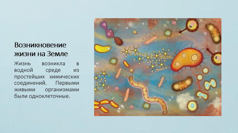 Развитие живой природы на Земле происходило в течение миллиардов лет. Учёные считают, что жизнь возникла в водной среде из простейших химических соединений. Первыми живыми организмами были одноклеточные, способные существовать в условиях древней Земли.