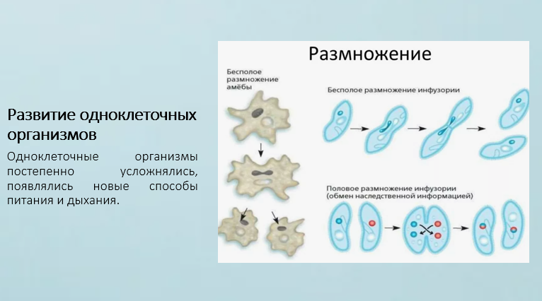 Со временем одноклеточные организмы усложнялись, появились многоклеточные формы жизни. Это позволило организмам выполнять разные функции и лучше приспосабливаться к условиям среды.