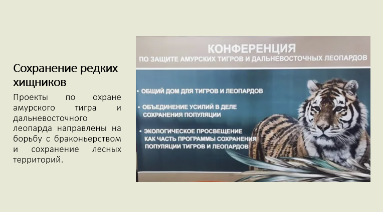 Большое значение имеют программы по охране амурского тигра и дальневосточного леопарда. В рамках этих проектов усиливается борьба с браконьерством, расширяются охраняемые природные территории и проводится мониторинг численности животных.