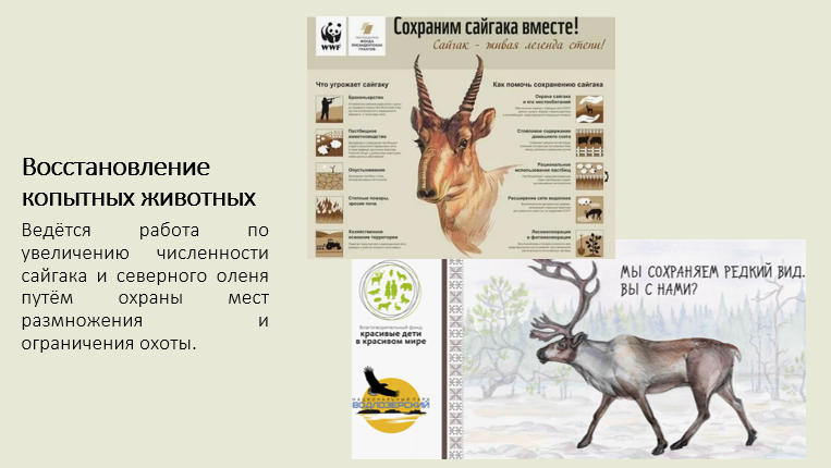 Успешно реализуются проекты по сохранению лошади Пржевальского, которую возвращают в естественные степные условия. Для копытных животных, таких как сайгак, создаются специальные охранные зоны и вводятся ограничения на охоту.
