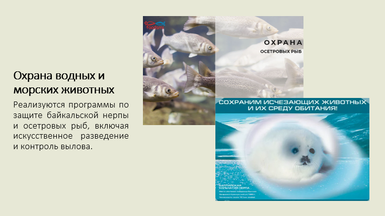 Важную роль играют проекты по защите водных животных, например байкальской нерпы и осетровых рыб. Они включают контроль вылова и искусственное воспроизводство.