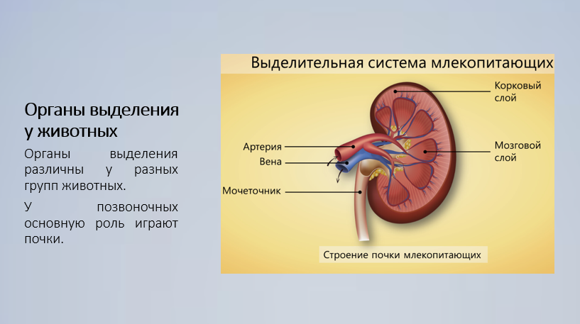 Добавить текст Озвучить Вернуть оригиналВ процессе обмена веществ в организме животных образуются продукты распада белков, жиров и углеводов. Если эти вещества не выводить, они накапливаются и могут привести к отравлению организма. Поэтому выделение необходимо для нормальной работы всех органов и систем.
