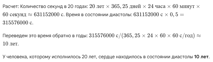 Добавить текст Вернуть оригинал8. Определите, сколько лет у человека сердце находится в состоянии диастолы, если ему исполнилось 20 лет.