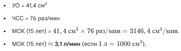 Величина минутного объёма крови у 14-летнего подростка составляет 3003 см³/мин, а у 15-летнего подростка — 3146,4 см³/мин.