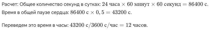 Общая пауза сердца (общая диастола) в течение суток длится 43 200 секунд, или 12 часов.