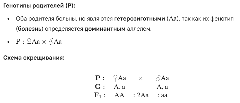 Добавить текст Вернуть оригиналНаследственная болезнь, обусловленная доминантным геном (А), проявляется в каждом поколении. Здоровые дети (рецессивный признак) могут родиться только в том случае, если оба больных родителя являются гетерозиготными носителями.