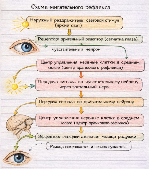 11. Выполните лабораторную работу «Изучение изменения размера зрачка в зависимости от освещённости» на с. 49. Опишите возможную структуру рефлекторной дуги изучаемого рефлекса. Зарисуйте схему мигательного рефлекса и подпишите структурные элементы рефлекторной дуги.