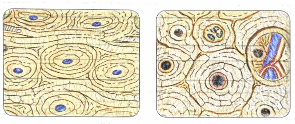 9. Изучите особенности строения костной ткани, выполнив лабораторную работу «Изучение микроскопического строения кости» на с. 77 учебника. Сначала рассмотрите препарат при малом увеличении микроскопа, обратив внимание на упорядоченное расположение костных пластинок. Затем рассмотрите микропрепарат при большом увеличении и зарисуйте его.